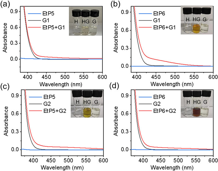 | Fig. 2. UV-vis spectra (CHCl3) of (a) (H) EtP5 (5.0 mmol/L), (G) G1 (20.0 mmol/L), (HG) EtP5 (5.0 mmol/L) and G1 (20.0 mmol/L); (b) (H) EtP6 (5.0 mmol/L), (G) G1 (20.0 mmol/L), (HG) EtP6 (5.0 mmol/L) and G1 (20.0 mmol/L); (c) (H) EtP5 (5.0 mmol/L), (G) G2 (20.0 mmol/L), (HG) EtP5 (5.0 mmol/L) and G2 (20.0 mmol/L); and (d) (H) EtP6 (5.0 mmol/L), (G) G2 (20.0 mmol/L), (HG) EtP6 (5.0 mmol/L) and G2 (20.0 mmol/L). | |
