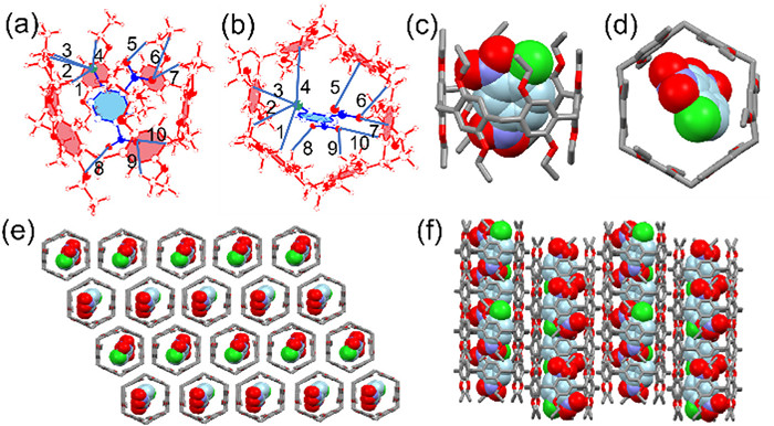 | Fig. 3. (a, b) Ball-stick views of the crystal structures of EtP6⊃G1. Host EtP6 is red, guest G1 is blue, oxygen atoms are solid and red, and nitrogen atoms are solid and blue. In EtP6⊃G1, 1–4 indicating C–H···Cl interactions, 5–10 indicating C–H···O interactions. (c, d) Crystal structure of the host–guest complex between EtP6 and G1. Host EtP6 is in a capped stick model, and guest G1 is in a space-filling model. (e, f) Packing structure of EtP6⊃G1, revealing that the guest molecules were encapsulated in the one-dimensional channel formed by EtP6. | |