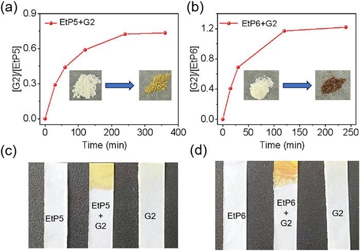 | Fig. 6. (a) Time-dependent solid-liquid adsorption plot for EtP5 towards G2. (b) Time-dependent solid-liquid adsorption plot for EtP6 towards G2. The inserted photographs show the colour deepening of pillararenes upon the adsorption of guests. Test papers made from (c) EtP5 and (d) EtP6, showing significant colour changes in detection of G2. | |