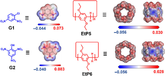 We initiated our study by computing the electrostatic potential maps of pillar[n]arenes, which uncovered the electron-rich nature of their aromatic walls (indicated by the blue area, suggesting an abundance of electrons, as illustrated in Scheme 1). Furthermore, we assessed the electron distribution of G1 and G2 by calculating their respective electrostatic potential maps. Interestingly, both G1 and G2 exhibited a significant electron deficiency in their aromatic regions (indicated by the red area, suggesting a relative absence of electrons). Based on these findings, we proposed that pillar[n]arenes, including perethylated pillar[5]arenes (EtP5) and pillar[6]arenes (EtP6) may possess a strong binding capability towards electron-poor nitro compounds through charge-transfer interactions, owing to their electronic complementarity.