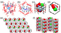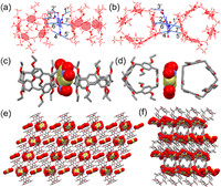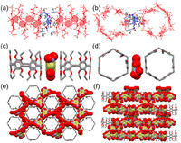 | Fig. 5. (a, b) Ball-stick views of the crystal structures of EtP6⊃G2. Host EtP6 is red, guest G2 is blue, oxygen atoms are solid and red, and nitrogen atoms are solid and blue. In EtP6⊃G2, 1’–8’ indicate C–H···O interactions, 9’ and 10’ indicate π–π interactions. (c, d) Crystal structure of the host-guest complex between EtP6 and G2. Host EtP6 is in a capped stick model, and guest G2 is in a space-filling model. (e, f) Packing structure of EtP6⊃G2, showing an exo-wall tessellation host–guest complex. | |