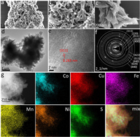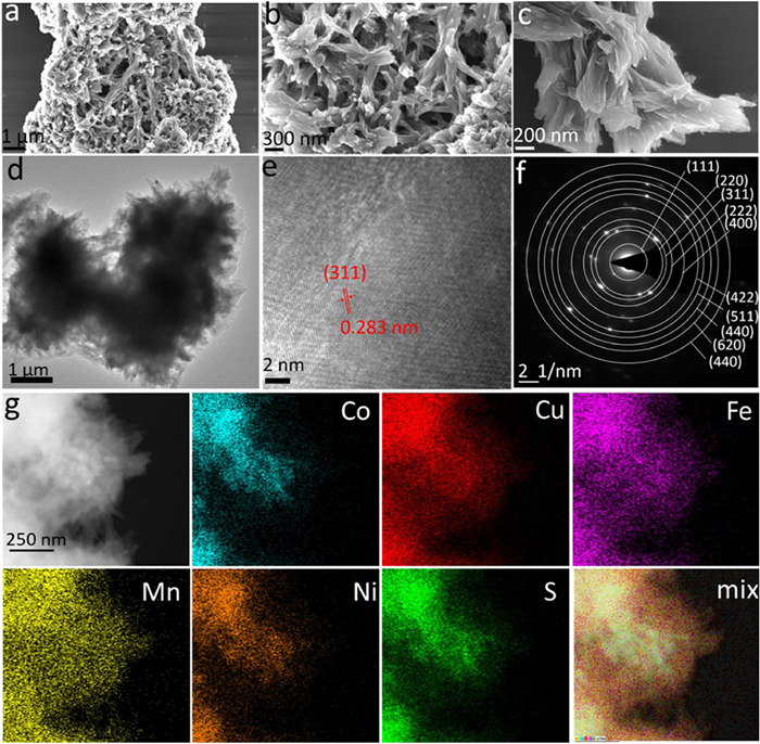 | Fig. 2. Structural and morphological characterization of FeCoNiCuMnSx. (a-c) SEM images at various magnifications, (d) TEM image, (e) high-resolution TEM image, (f) SAED pattern, (g) high-angle annular dark-field scanning transmission electron microscopy (HAADF-STEM) image with its corresponding elemental mapping images. | |