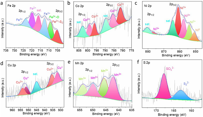 | Fig. 3. High-resolution XPS spectra of Fe 2p (a), Co 2p (b), Ni 2p (c), Cu 2p (d), Mn 2p (e), S 2p (f) in FeCoNiCuMnSx. | |