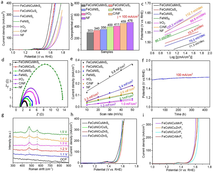 | Fig. 4. Electrochemical OER performance of the FeCoNiCuMnSx and these controlled samples. (a) LSV curves with 85% IR correct collected at 1 mV/s. (b) Comparison of overpotentials at current density of 100 mA/cm2. (c) Tafel slopes. (d) EIS spectra measured at 1.52 V vs. RHE. (e) The slop corresponding to the specific capacitance in the non-Faradaic region (Cdl). (f) Chronopotentiometric curve of FeCoNiCuMnSx at 100 mA/cm2. (g) In-situ Raman spectrum of FeCoNiCuMnSx tested at different potentials. LSV curves of different HESs (h) and HEPs (i). | |