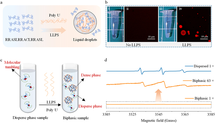 | Fig. 1. Arginine-rich peptide phase separation. (a) Schematic illustration of polyU RNA added to a solution of RRASLRRACLRRASL, which results in phase separation. (b) Comparison of the turbidities of the non-LLPS sample (i) and LLPS sample (iii). Fluorescence imaging of the non-LLPS sample (ii) and LLPS sample (iv). Scale bar: 10 µm. The concentration of polypeptides was 1 mmol/L, and that of polyU was 1 mg/mL in the LLPS sample. The concentration of peptides was 1 mmol/L in the non-LLPS sample without polyU. (c) Schematic representation of the transition from the dispersed state to the phase separation state in terms of the molecular dynamic properties. (d) EPR spectra of dispersed (blue line) and biphasic (orange line) samples. The arrow indicates the EPR spectrum of the biphasic sample with 63× magnification. The dispersed sample was incubated in 50 mmol/L HEPES buffer containing 460 µmol/L peptide in the absence of polyU. The biphasic sample was incubated in 50 mmol/L HEPES buffer containing 460 µmol/L peptide in the presence of 1 mg/mL polyU. | |