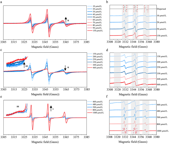 | Fig. 2. EPR spectra of the peptide in 50 mmol/L HEPES buffer at different concentrations in the presence of 1 mg/mL polyU. Changes in the signal intensity of the EPR spectra at low, higher, and high peptide concentrations (a, c, and e, respectively). Arrows indicate the signatures in the spectrum of the three different components: a fast motion component (Ⅰ), a slower motion component (Ⅱ) and an immobile component (Ⅲ). The insets show a magnification of the regions marked with arrows. Scaling of the spectra to the same intensity of the central line shown in the monomeric peptide spectrum (gray line) enables clear comparison of EPR spectrum broadening at low, higher, and high peptide concentrations (b, d, and f, respectively). | |