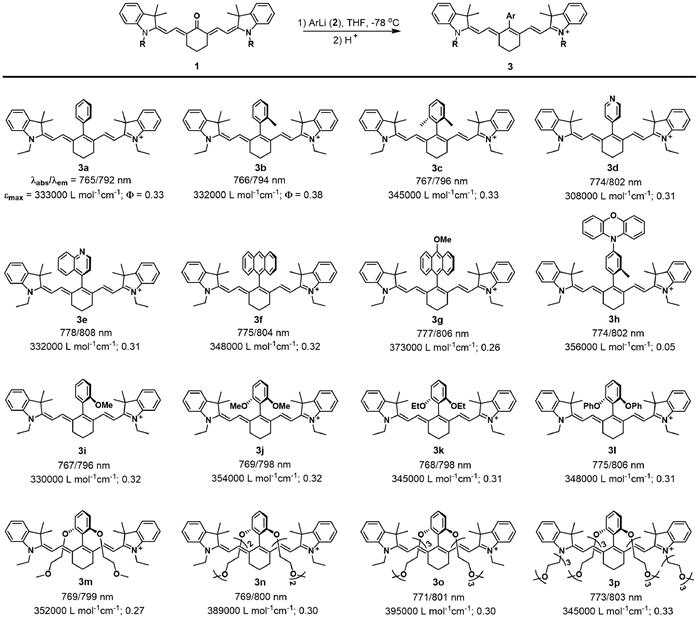 Our design was inspired by the synthesis of meso–aryl rhodamine fluorophores that employed xanthones as the precursors [52-55]. We envisioned that the approach should also be amenable to the synthesis of meso–aryl heptamethine indocyanines, provided that cyanine ketone precursor 1 (Fig. 1) could be easily obtained. In fact, the compound was first synthesized in 1992 by the one-step reaction of Cl-Cy7 with sodium acetate in N,N-dimethylformamide (DMF), showing absorption and emission maxima at 535 nm and 625 nm, respectively [56]. Upon protonation, it could be transformed into meso–hydroxyl cyanine with absorption and emission maxima at 710 nm and 730 nm, respectively [57-61]. The early work is the start point of our subsequent studies. According to the reported procedure [56], we first synthesized the simplest cyanine ketone 1a, and then tested its reaction with phenyl lithium 2a in THF at −78 ℃. To our delight, the reaction, followed by acidification with aqueous 1 mol/L HCl, provided the meso–phenyl heptamethine indocyanine 3a in 82.4% yield (Fig. 1). This result reveals that our cyanine ketone method should be feasible for fabricating various meso–aryl heptamethine indocyanines.