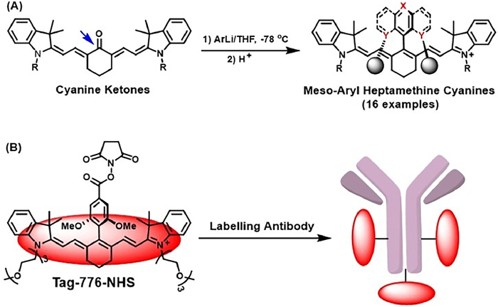In this work, for the first time we put forward a simple and universal "cyanine ketone method" for fabricating the meso–aryl heptamethine indocyanine NIR fluorescent dyes (Scheme 2A). As seen, the treatment of the easy-to-get cyanine ketones with various aromatic lithium reagents (ArLi), followed by acidification, could directly give rise to meso–aryl heptamethine indocyanines in one-pot way. Importantly, thanks to the strong nucleophilicity of ArLi reagents, various bulky hydrophilic aromatic groups could easily be integrated into the meso–position of heptamethine indocyanine skeletons, enabling the facile one-pot accessing of the sterically shielded and anti-aggregation meso–aryl heptamethine indocyanines. Using one of the anti-aggregation meso–aryl heptamethine indocyanines, we have successfully fabricated a PEGylated protein labeling agent Tag-776-NHS to label monoclonal antibody panitumumab for in vivo imaging tumor (Scheme 2B), and obtained a high tumor-to-normal (T/N) tissue ratio in a tumor-bearing mouse model.