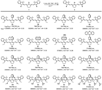 | Fig. 1. Various meso–aryl heptamethine cyanine fluorophores synthesized by our one-pot cyanine ketone method in this work. Absorption maxima (λabs, nm)/emission maxima (λem, nm), molar extinction coefficients (ε, L mol−1 cm−1), and fluorescence quantum yields [Φ, determined using Cy7 (Φf = 0.24 in MeOH) as a reference] measured in CH2Cl2 were shown. | |