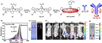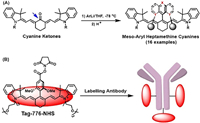 | Scheme 2. (A) Cyanine ketone method for fabricating various meso–aryl heptamethine indocyanines. X refers to C or N atom, Y to C or O atom, and spherical body to the sterically shielded arms. (B) Application in developing anti-aggregation labeling agent Tag-776-NHS to label antibody for in vivo imaging tumor. | |