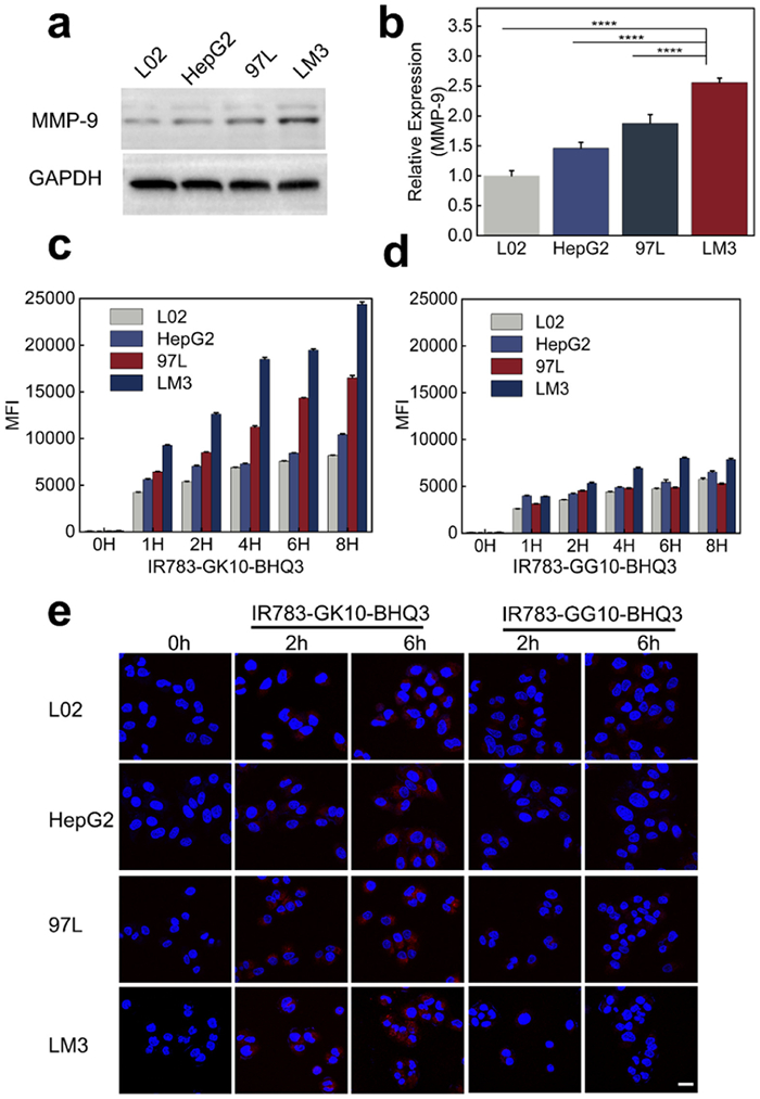 | Fig. 2. (a) MMP-9 expression and (b) quantification in normal hepatocyte L02 cells and HCC cells (HepG2, 97L, and LM3). (c) Cellular uptake of IR783-GK10-BHQ3 and (d) IR783-GG10-BHQ3 in L02, HepG2, 97L, and LM3 cells using flow cytometry analysis, as well as (e) laser confocal observation. Scale bar: 25 µm. All data are presented as means ± SD from at least three independent experiments. ****P < 0.0001. GAPDH, glyceraldehyde 3-phosphate dehydrogenase; MFI, mean fluorescence intensity. | |