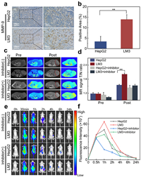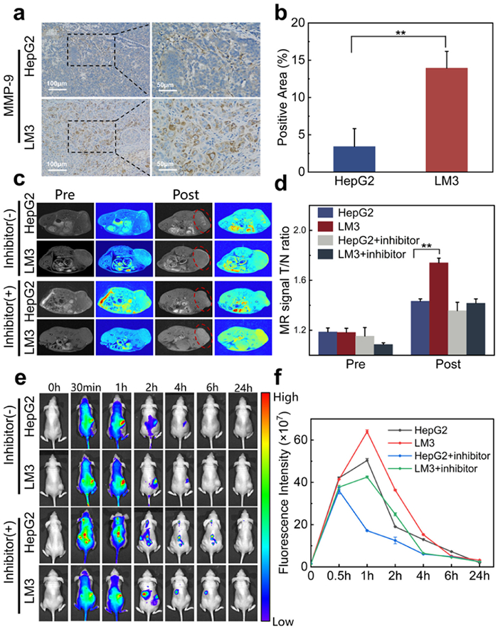 | Fig. 4. (a) Immunohistochemical staining and (b) quantification analysis of the MMP-9 expression in HepG2 and LM3 tumor tissues. Scale bar: 100 µm. (c) T1-weighted MR imaging of HepG2 and LM3 tumor-bearing mice before and after tail vein injection of IR783-GK10-BHQ3-Gd probe (4 mg/kg, 100 µL) with or without inhibitor SB-3CT pretreatment. (d) Quantification of MR signal of tumor in panel c. (e) Fluorescence imaging of tumor-bearing mice at various time points following tail vein injection of IR783-GK10-BHQ3-Gd probe (2 mg/kg, 100 µL) with or without inhibitor SB-3CT pretreatment. (f) Quantification of the tumor fluorescence signal in panel e. All data are presented as means ± SD from at least three independent experiments. **P < 0.01. | |