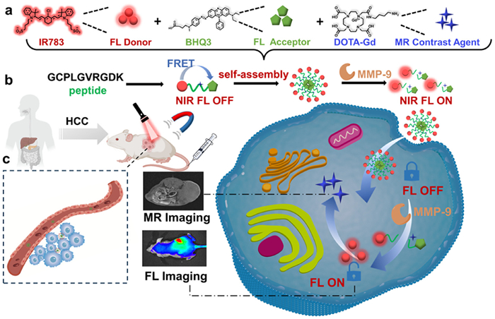 However, fluorescence imaging alone cannot provide precise localization information of diseased tissue [33,40,41]. In contrast, magnetic resonance (MR) imaging offers advantages such as ionizing radiation-free imaging, exceptional spatial resolution, and precise structural positioning, making it an excellent tool for liver cancer diagnosis [42-44]. By integrating the advantages of both imaging modalities, designing a probe endowed with dual-mode imaging capabilities of fluorescence and MR imaging could significantly enhance the precise imaging of HCC with different metastatic capacities. However, there is a lack of studies on MMP-9 responsive probes for imaging assessment of HCC metastasis, particularly in the fluorescence-MR dual-mode imaging probes.