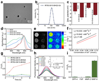 | Fig. 1. (a) TEM image of IR 783-GK10-BHQ3-Gd. (b) The distribution of hydrodynamic size of IR 783-GK10-BHQ3-Gd. (c) Zeta potential and (d) UV–vis absorption spectra of IR783, IR783-GK10, IR783-GK10-BHQ3 and IR783-GK10-BHQ3-Gd. (e) T1-weighted MR imaging and (f) relaxation curve of IR783-GK10-BHQ3-Gd. (g) Fluorescence signal intensity growth rates of IR783-GK10, IR783-GG10-BHQ3, IR783-GK10-BHQ3 incubated with MMP-9 for different times. (h) Fluorescence spectra of IR783-GK10-BHQ3-Gd incubation with different concentrations of MMP-9 (inset: Fluorescence growth rate of IR783-GK10-BHQ3-Gd probe incubated with varies MMP-9 concentration). (i) Fluorescence growth rate (I − I0)/I0 of the probe incubated with different types of enzymes. All data are presented as mean ± standard deviation (SD) (n = 3). mM = mmol/L. | |