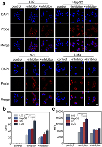 To further verify the positive correlation between the fluorescence effect and MMP-9 content, cells were pretreated with the inhibitor SB-3CT, and then observed using a combination of laser confocal microscope (Figs. 3a and b) and flow cytometry (Fig. 3c). It is found that addition of inhibitor significantly inhibits the fluorescence signal. Upon comparing the fluorescence intensity of different cells, it is noted that normal L02 cells show a lower fluorescence signal compared to HCC cells HepG2, 97L and LM3. Notably, the highly metastatic HCC cells LM3 show higher expression of MMP-9, resulting in the highest fluorescence signal. The above findings collectively indicate that the IR783-GK10-BHQ3-Gd probe can specifically image MMP-9 activity in HCC cells and has the potential to distinguish HCC cells with different metastatic abilities.
