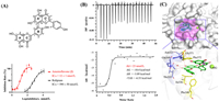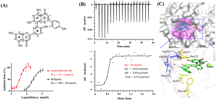 | Fig. 2. The inhibitory/binding profiles of amentoflavone (2) with PDE4. (A) Inhibitory curve of 2 against PDE4 in enzymatic assay. IC50 data were calculated by the nonlinear regression method and presented as mean ± standard deviation (SD) (n = 3). (B) The binding affinity of 2 with PDE4 determined by ITC. (C) The co-crystal structure of PDE4–2 (PDB ID: 8YLC). The 2Fo–Fc electron density is contoured in dark blue at 1.0 σ and H-bonds are presented in red dotted lines. | |