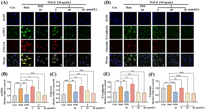 | Fig. 3. The in vitro anti-IPF effects of 2 in TGF-β induced NIH-3T3 and A549 cell models. Pirfenidone (PFD) served as a positive control and the concentration in cell model were 10 µmol/L. (A–C) Immunofluorescence analysis of α-SMA and COL1A1 in TGF-β induced NIH-3T3 cell model. (D–F) Immunofluorescence analysis of N-cadherin and vimentin in TGF-β induced A549 cell model. Scale bar: 20 µm. DAPI, 4′, 6-diamidino-2-phenylindole; ns, no significance. *P < 0.05, **P < 0.01, ***P < 0.001, ****P < 0.0001, compared with TGF-β-treated cells. Data are presented as mean ± standard error of the mean (SEM) (n = 3). | |