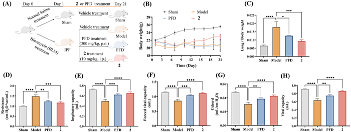 | Fig. 4. The in vivo anti-IPF effect of 2 in BLM-induced mouse model. (A) Schematic diagram of animal study and compounds treatment. (B) The body weight of mice. (C) The ratio of lung to body weight. (D–H) The pulmonary functions of resistance, inspiratory capacity, forced vital capacity, Cchord and vital capacity. *P < 0.05, **P < 0.01, ***P < 0.001, ****P < 0.0001, compared with BLM-treated model mice. Data are presented as mean ± SEM (n = 8–12 mice per group). | |