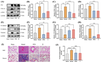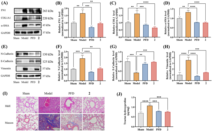 | Fig. 5. Compound 2 could effectively decrease the expression levels of several hallmark markers in IPF mice. (A–D) Quantification of the protein levels of FN1, COL1A1, and α-SMA. (E–H) Quantification of the protein levels of N-cadherin, E-cadherin and vimentin. (I) Representative images of H & E staining and Masson staining. Scale bar: 100 µm. (J) The concentration of tractus hydroxyproline of lung tissues. *P < 0.05, **P < 0.01, ***P < 0.001, ****P < 0.0001, compared with BLM-treated model mice. GAPDH, glyceraldehyde-3-phosphate dehydrogenase. Data are presented as mean ± SEM (n = 6). | |