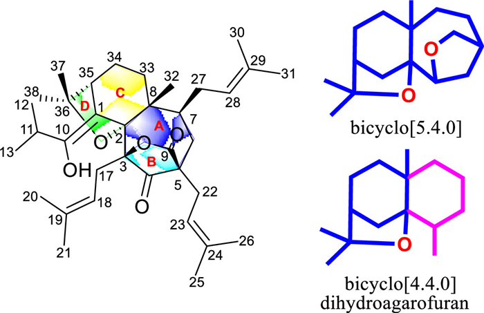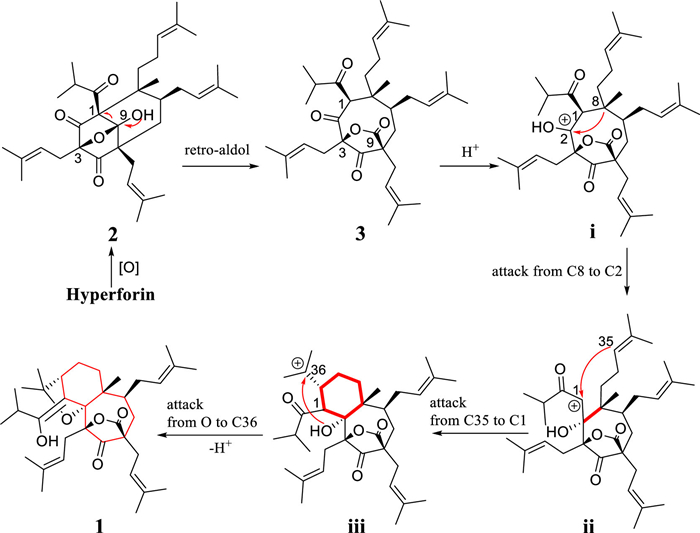 Polycyclic polyprenylated acylphloroglucinols (PPAPs) are a special secondary metabolites from the genus Hypericum. Acylphloroglucinol core decorated with prenyl and isoprenyl groups can further be oxidized and cyclized to build the complexity and diversity of PPAPs [1, 2]. So far > 1000 members of the PPAPs have been reported, of which the majority is the typical [3, 3, 1]nonane-2, 4, 9-trione core PPAPs [3]. Biosynthetically, bicyclic PPAPs can be further cyclized to caged PPAPs or be oxidized to open the ring to generate seco-PPAPs [2]. The seco-PPAPs were considered to be formed by the cleavage of chemical bonds at different positions, including 1, 2-seco, 2, 3-seco, 3, 4-seco, 1, 9-seco, 1, 2;4, 5-diseco [2, 4-6]. Around 40 intriguing architectures of seco-PPAPs were characterized [7].