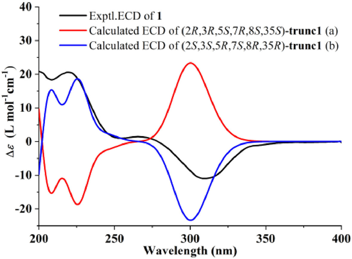 The absolute configuration was further confirmed by the ECD calculation. The calculated ECD spectrum of (2S, 3S, 5R, 7S, 8R, 35R)−1 was fully matched with the experimental ECD spectrum with positive Cotton effect around 200 and 225 nm and negative Cotton effect around 310 nm (Fig. 4). Finally, the orthorhombic crystals of 1 were obtained from acetone, and the single-crystal X-ray diffraction analysis (Cu Kα) [Flack parameter = −0.06(6)] unequivocally confirmed the structural assignments (Fig. 5). Thus, the absolute configuration of 1 was clarified as 2S, 3S, 5R, 7S, 8R, 35R.