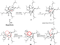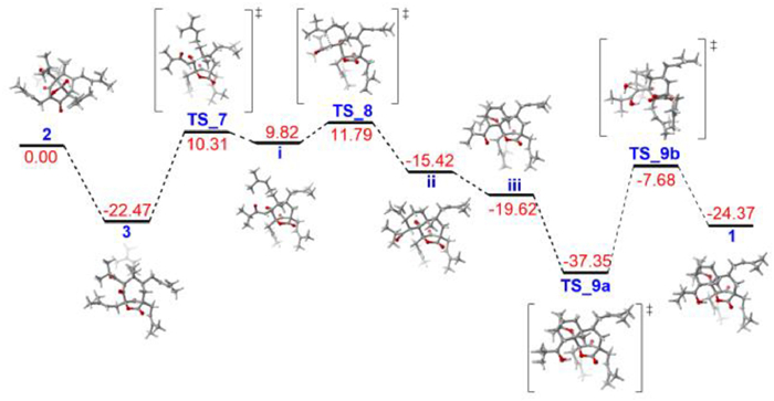 Based on the calculated results of the cationic process (Scheme 1 and Fig. 6), 1 might derive from hyperforin (HF), the antidepressant constituent of St John's wort, via a crucial intermediate hemiketal 2. Then, 2 cleaved the C-1/C-9 bond via a retro-aldol mechanism to form a five-membered lactone fragment (B ring) of 3 with free energy of −22.47 kcal/mol. The carbonyl carbon (C-2) occurred to protonation. Then the key intermediate (i) of the seven-membered A ring was produced by the heterolytic cleavage of the C-1/C-8 bond and the formation of the C-2/C-8 bond which the tert-alkyl anion of C-8 attacked to the carbonyl cation of C-2 [26, 27]. The process needed to overcome the activation barrier (ΔG = 32.78 kcal/mol). It was easier to form the C ring through the pair of electrons of the olefinic bond at C-35 attacking to the cation of C-1 to afford the intermediate ii by transition structure (TS_8) with an activation free energy barrier of 1.97 kcal/mol. It tended to form the D ring from intermediate ii to intermediate iii, because of the distance (3.65 Å) between the oxygen at C-2 and the carbon of C-36, a barrier-free and exergonic step (ΔG = −4.20 kcal/mol). Finally, 1 was obtained by the ketone/alcohol conversion, which the process included protonation of the carbonyl O under acidic condition (TS_9a with a free energy of −37.35 kcal/mol) and deprivation of the proton at C-1 position (TS_9b with a free energy of −7.68 kcal/mol).