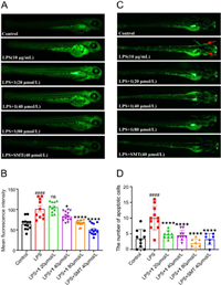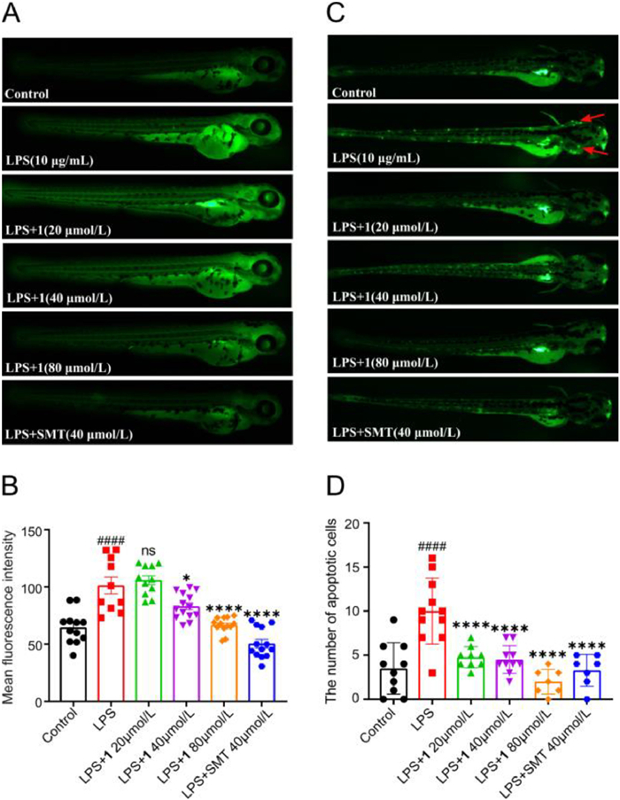 | Fig. 7. Effects of compound 1 on NO production and neuronal apoptosis in LPS-induced zebrafish. (A, C) NO production and neuronal apoptosis were imaged using fluorescence microscopy. (B, D) Mean fluorescence intensity and the number of apoptotic cells were quantified using Image J. ####P < 0.0001 vs. control (DMSO) group; P < 0.05, ****P < 0.0001 vs. LPS group (ns, no significance). | |