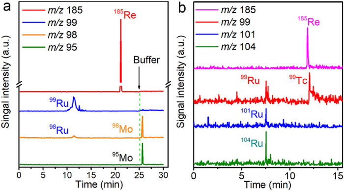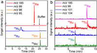 The main purpose of this experiment is to eliminate the isobaric interferences on the determination of 99Tc. As a consequence, the initial experiment was to investigate that the feasibility of CE-ICP-MS on the separation and analysis of TcO4-, RuO4-, and MoO42-. Since the conditions for radioactive experiment is limited in Sichuan University, ReO4- was thus used as substitutes analogous to TcO4- because of their similar physicochemical properties and electro-phoretic behavior. The schematic of the CE-ICP-MS system and the typical running parameters for non-radioactive experiments in Sichuan University are shown in Fig. S1 and Table S1 (Supporting information). According to previous work [47, 53, 54], a buffer solution containing 10 mmol/L K2CO3 (pH 11.0) was firstly used to separate and analyze KReO4, KRuO4, and K2MoO4 by CE-ICP-MS. The results summarized in Fig. S2 (Supporting information) show that the isolated signals for ReO4- and RuO4- can be clearly observed, whereas no signal is detected for MoO42- even the separation time longer than 40 min. This is probably because that MoO42- cannot be eluted from the capillary under this operating condition. Subsequently, we applied the pressure-assisted introduction of buffer solution to swept the compounds kept in the capillary into the ICP-MS after appearing the signals of ReO4- and RuO4-. Interestingly, the signals for 98Mo and 95Mo were detected besides of the signals for Re and Ru (Fig. 1a), confirming the aforementioned speculation and the feasibility of the CE-ICP-MS on the separation and analysis of ReO4- from RuO4- and MoO42-.