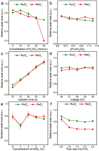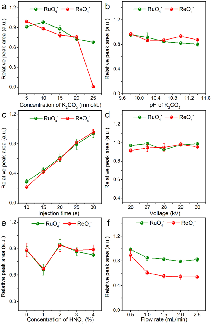 To achieve the optimal analytical performance for the separation of ReO4- and RuO4-, different parameters that affected the separation efficiency of CE-ICP-MS were initially optimized. The length of the capillary plays an important role in the separation efficiency and then FS-capillaries with length of 97 cm and 108 cm were conducted to explore their performances on the separation of RuO4- and ReO4-. From Fig. S4 (Supporting information), it showed that both these two FS-capillaries can achieve the complete separation of RuO4- and ReO4-, while a shorter FS-capillary can significantly save the analysis time. Thus, the FS-capillary of length of 97 cm was used in the subsequent experiments. The concentration of buffer directly affected the ionic strength of the electrophoretic medium, which further influenced the zeta potential and the electroosmotic flow (EOF). The concentrations of K2CO3 ranging from 5−25 mmol/L was investigated. Fig. 2a shows that the peak area of RuO4- increased as the buffer concentration increased from 5 mmol/L to 10 mmol/L and achieved the top at the buffer concentration of 10 mmol/L. The peak area of ReO4- decreased as the buffer concentration increased. The migration time of RuO4- and ReO4- prolonged with the increase of buffer concentration and could not obtain the signal of Re at the buffer concentration of 25 mmol/L (Fig. S5 in Supporting information). The buffer capacity increases with the increase of concentration of the buffer solution, ensuring that the pH and conductivity of the local separation buffer solution will not change at the moment of sample injection. However, excessively high salt concentration will generate more Joule heat reducing the separation efficiency of RuO4- and ReO4- and even could not obtain the signal of Re [55]. In addition, the high concentration of buffer solution also leads to the low nebulization efficiency of ICP-MS [56]. Therefore, 10 mmol/L of K2CO3 concentration was selected in the subsequent experiments.