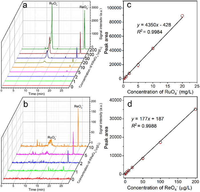 | Fig. 3. (a) The electropherograms of RuO4- and ReO4- with various concentrations of KReO4 from (a) 1−200 µg/L and (b) 1−10 µg/L, and corresponding typical calibration curves of (c) RuO4- and (d) ReO4-, respectively. | |