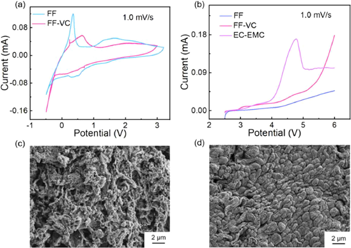 | Fig. 2. (a) CV curves of Li||Cu cells with different electrolytes at a scanning rate of 1 mV/s. (b) LSV curves of Li||Al cells at a scanning rate of 1 mV/s in different electrolytes. SEM images of Li metal surface in Li||NCM622 cells with (c) FF and (d) FF-VC electrolytes after 60 cycles at the 4.5 V cut-off voltage. | |