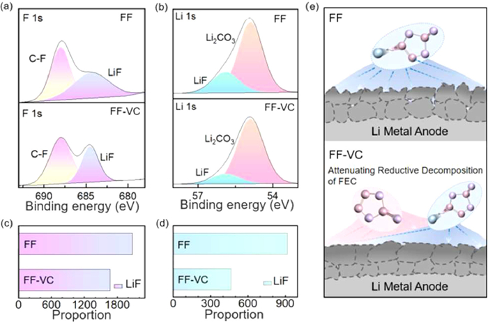 High-resolution X-ray photoelectron spectroscopy (XPS) of Ar sputtering was utilized to analyze the component of the SEIs (Figs. 3a and b). The LiF peak for the Li metal surface with FF electrolyte is much stronger and sharper than that of FF-VC electrolyte. Quantitative analysis of LiF contents (Figs. 3c and d) in two sets of electrolyte derived interface demonstrates that the addition of VC in fluorinated electrolyte significantly attenuates reductive decomposition of FEC, inhibiting the large amount of LiF generation.