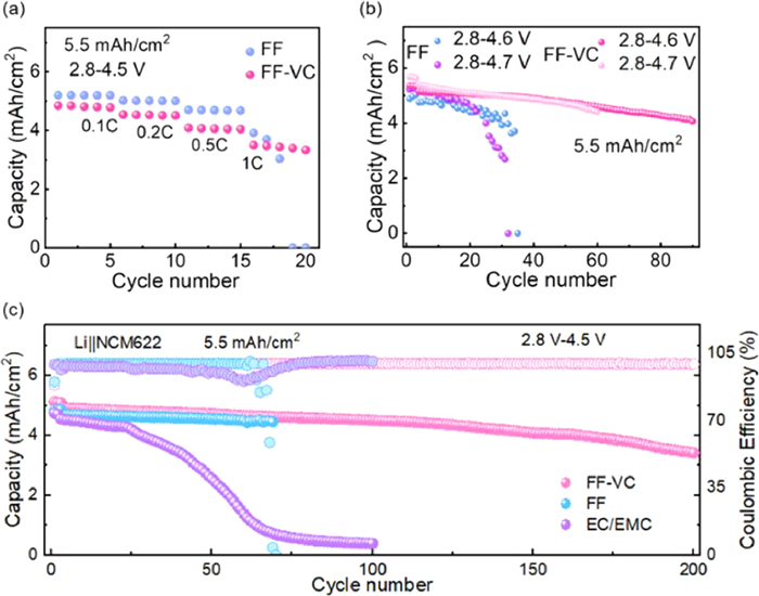 In order to evaluate the high-voltage stability of the cells with different electrolytes, Li||NCM622 cells are assembled (Fig. 4b). The cell with FF electrolyte experiences a rapid capacity decay at 4.6 V and 4.7 V due to the consumption of FEC. The life spans of high-voltage cells are significantly extended in the FF-VC electrolyte, achieving 4.06 mAh/cm2 and 4.42 mAh/cm2 after 60 and 92 cycles, respectively.