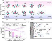 | Fig. 1. (a) HOMO and LUMO energy levels of commonly used solvents. (b) Charge and discharge curves of 1.2 mol/L LiPF6 in FEC/FEMC (v/v = 3:7) electrolyte under different cut-off voltages. The inset is the average cycle number of corresponding cells under different cut-off voltages. (c) Mechanistic diagram of rapid failure of 1.2 mol/L LiPF6 in FEC/FEMC (v/v = 3:7) electrolyte at the high cut-off voltage. | |