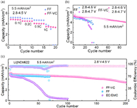 | Fig. 4. Electrochemical performances of Li||NCM622 cells. (a) Rate capability of cells at the voltage of 4.5 V. (b) Cycle stability of cells with FF and FF-VC electrolytes under the cut-off voltages of 4.6 V and 4.7 V. (c) Long cycle stability of cells with different electrolytes under the cut-off voltage of 4.5 V. | |