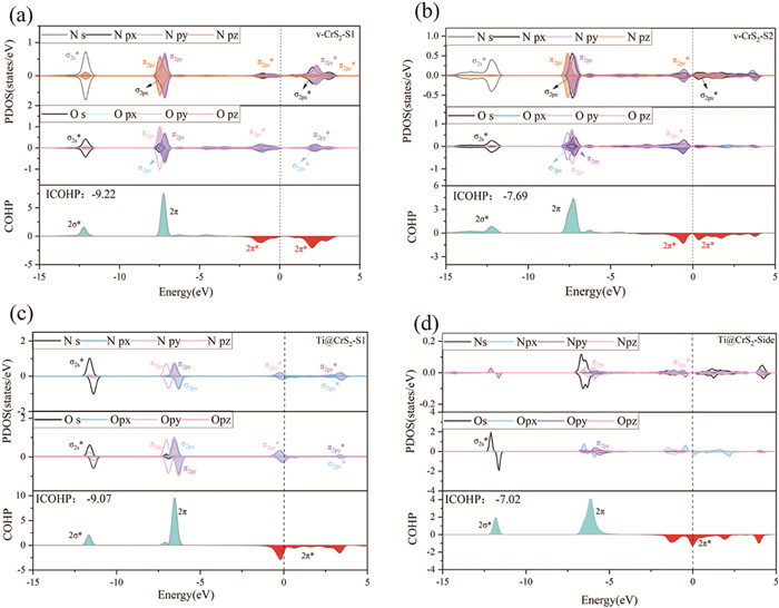 | Fig. 3. Electron density of state projection (PDOS) and crystal orbital Hamiltonian population analysis (COHP) of adsorbed NO on systems, including (a) v-CrS2-S1, (b) v-CrS2-S2, (c) Ti@CrS2-S1, and (d) Ti@CrS2-Side, respectively. | |