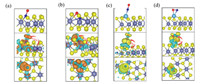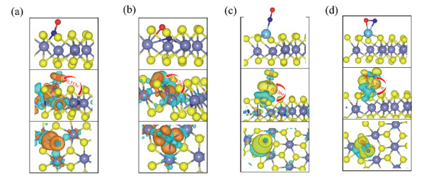 | Fig. 4. The charge density difference between NO and substrates, including (a) v-CrS2-S1, (b) v-CrS2-S2, (c) Ti@CrS2-S1, and (d) Ti@CrS2-Side, respectively. The yellow (orange) and green areas denote the accumulation and depletion of charge, respectively. Cr, S, N and O atoms are denoted with the forms of purple, yellow, blue, and red, respectively. | |