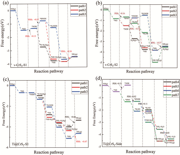 Above all, the free energy profiles have demonstrated that both v-CrS2 and Ti@CrS2 can effectively activate NO to produce NH3 at the limiting potentials of −0.03 ~ −0.47 V, with different reaction mechanisms. The configurations of intermediates of rate-controlling steps are demonstrated in Fig. S4 (Supporting information).