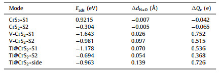 Table 1 The properties of NO adsorbed on various systems, including CrS2-S1, CrS2-S2, v-CrS2-S1, v-CrS2-S2, Ti@CrS2-S1, Ti@CrS2-S2, and Ti@CrS2-side. The Eads[*NO] (∆dN—O and ∆QC) indicates the adsorption energy of NO (the N—O bond length of adsorbed NO and the charge transfer between NO and the substrate). |