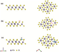 | Fig. 1. Optimized geometrical structures of (a) CrS2, (b) v-CrS2, and (c) Ti@CrS2. Cr, S and Ti atoms are represented by purple, yellow and pale bule, respectively. | |