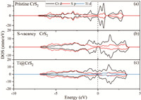 | Fig. 5. The density of states of (a) pristine CrS2, (b) v-CrS2, and (c) Ti@CrS2. The upper and lower panels indicate the upward and downward spin states, respectively. The Fermi energy level is set to zero. | |