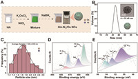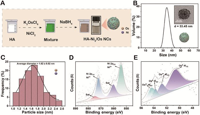 | Fig. 1. (A) Schematic representation of the synthesis process. (B) The hydrodynamic size distribution of HA-Ni2/Os. Inset: TEM image of single HA-Ni2/Os. (C) Gaussian fitting of the size distribution of Ni2/Os in HA-Ni2/Os (100 random). XPS spectra of (D) Ni 2p and (E) Os 4f in HA-Ni2/Os. | |