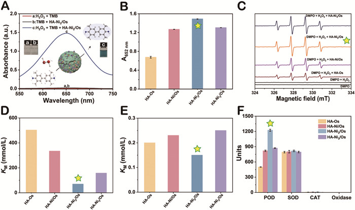 | Fig. 2. (A) UV–vis spectrum: TMB + H2O2, TMB + HA-Ni2/Os. and TMB + H2O2 + HA-Ni2/Os. Inset: Schematic representation and corresponding photographs. (B) Histogram: the absorbance at 652 nm of TMB + H2O2 for different HA-Nin/Os. (C) ESR spectrum of H2O2 with different nanozymes employing DMPO as a spin trap. Steady-state kinetic parameters of different HA-Nin/Os toward (D) H2O2 and (E) TMB. (F) Peroxidase (POD), superoxide dismutase (SOD), catalase (CAT), and oxidase-like activities of different HA-Nin/Os. The error bar represents the standard deviation from the repeated experiments after three times. | |