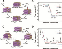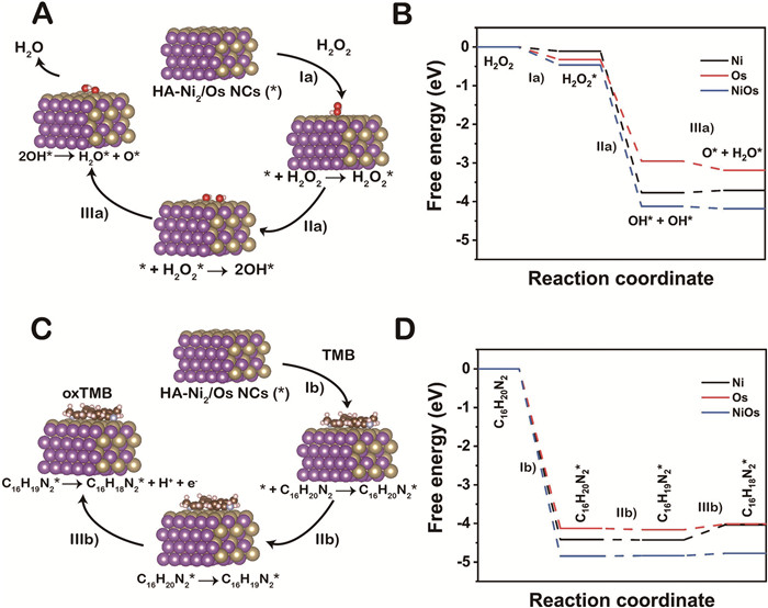 | Fig. 3. (A) Proposed H2O2 cleavage pathway on the Ni/Os surface. (B) Free energy diagrams for H2O2 cleavage on Ni, Os, and Ni/Os surfaces. (C) Proposed TMB oxidation pathway on the Ni/Os surface. (D) Free energy diagrams for TMB oxidation on Ni, Os, and Ni/Os surfaces. | |