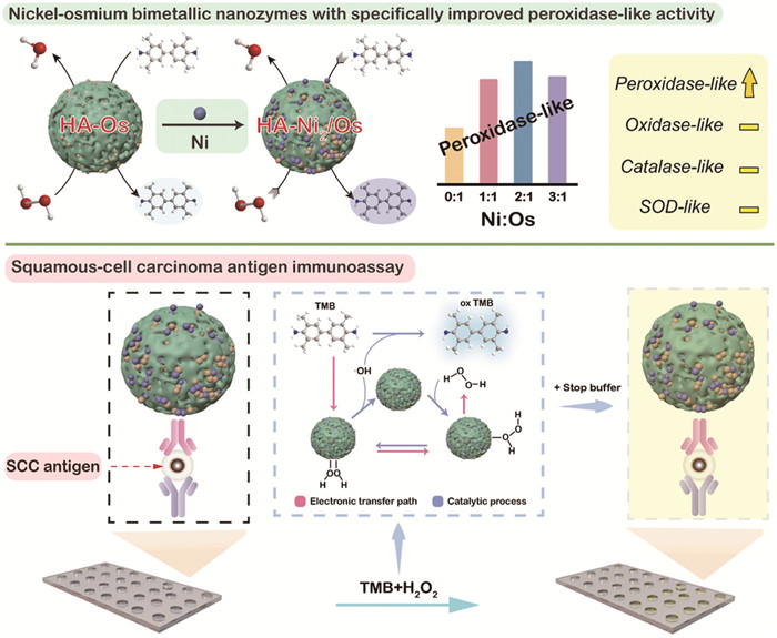 In summary, this study has successfully introduced a bimetallic nanozyme, HA-Ni2/Os, developed by incorporating Ni and Os with HA. Experiments have confirmed their formation and peroxidase-like behavior. The role of Ni in augmenting the peroxidase-like activity of Os nanozyme has been demonstrated, showcasing an over two-fold increase in activity compared to non-Ni-supported Os nanozyme. DFT results also indicate HA-Ni2/Os in enhancing H2O2 adsorption and TMB oxidation, boosting their peroxidase-like activity. Importantly, the support of Ni does not significantly alter the other enzyme-like activities of Os nanozymes, thereby enabling Ni to selectively enhance their peroxidase-like activity. Utilizing the enhanced peroxidase-like activity of HA-Ni2/Os and HA's carboxyl groups, a sensitive and selective nanozyme-linked immunoassay achieved an LOD of 1.55 pg/mL for SCCA detection. Moreover, HA-Ni2/Os presented excellent stability unparalleled by natural enzymes. This research underscores Ni's pivotal role in improving the peroxidase-like performance of Os-based bimetallic nanozymes, promising advancements in analytics and diagnostics.