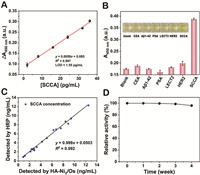 | Fig. 4. (A) Linear calibration plot of ΔA450 nm with various SCCA concentrations. (B) Selectivity of HA-Ni2/Os-based SCCA immunoassay. Inset: Corresponding photographs. (C) Correlation analysis between the HA-Ni2/Os-based and HRP-based SCCA immunoassay in separately quantifying SCCA from clinical serum samples. (D) Catalytic stability of HA-Ni2/Os after incubation at room temperature for one month. The error bar represents the standard deviation from the repeated experiments after three times. | |
