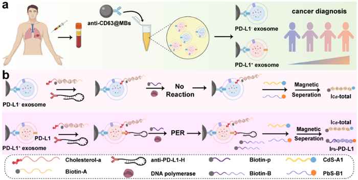 To address the problem, we herein report a dual-labelled membrane interface-based electrochemical method for precise evaluation of lung cancer-derived exosomes by using both CD63 and programmable death ligand-1 (PD-L1) as exosomal biomarkers. Specifically, CD63 is used as a universal biomarker; and PD-L1, which displays an increased exosomal level with the worse outcome and response to immunotherapy in non-small cell lung cancer is utilized as a tumor-specific biomarker for better understanding of lung cancer. PD-L1 can inhibit the activity of T cells by binding to programmed cell death receptor 1 (PD-1) to enhance tumor immune tolerance. The presence of exosomal PD-L1 is associated with the occurrence of non-small cell lung cancer and the disease progression during immunotherapy treatment. This highlights the potential of exosomal PD-L1 as a biomarker for detecting non-small lung cancer at an early stage and predicting the response to immunotherapy [17-19]. Fig. 1 depicts the principle and workflow of the method. CD63 is first used to enrich exosomes onto CD63 antibody-functionalized magnetic beads (anti-CD63@MBs). Two DNA probes are then prepared to label the membrane of enriched exosomes. One is a cholesterol-modified DNA probe, cholesterol-a/biotin-A, which is able to insert into the exosome membrane through hydrophobic interaction of cholesterol and phospholipid [20]; another one is a PD-L1 antibody-nucleic acid probe, anti-PD-L1-H, which could specially bind to surface-expressing PD-L1. These two probes subsequently participate in two independent DNA assembly reactions, and couple with two quantum dots-tagged signal strands (CdS-A1 and PbS-B1). On one hand, the nucleic acid part (H) of anti-PD-L1-H acts as a catalytic hairpin to trigger a primer exchange reaction (PER) and leads to the programmable extension of a biotin-labeled primer, biotin-p [21]. Thereafter, the extended product, biotin-B, further hybridizes with PbS-B1 to produce a duplex DNA product, PbS-B1/biotin-B. On the other hand, cholesterol-a/biotin-A reacts with CdS-A1 directly, and produces another duplex DNA product, CdS-A1/biotin-A, via a strand displacement reaction. Both duplex DNA products (CdS-A1/biotin-A and PbS-B1/biotin-B) are finally enriched by streptavidin-functionalized MBs, and produce stripping signals of Cd and Pb to obtain quantitative information of total exosome and surface-expressing PD-L1, respectively. On this basis, a ratiometric signal is recruited as a quantitative index to reflect the variation in PD-L1 expressions at the exosome level.