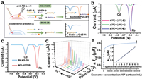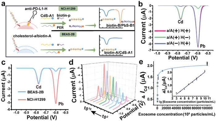 | Fig. 2. (a) The workflow for the electrochemical analysis of exosomes. (b) Electrochemical responses with the input of different DNA probes at PD-L1-expressing exosomes. Probes a/A and H represented the cholesterol-a/biotin-A and anti-PD-L1-H, respectively. (c) Electrochemical responses obtained with the addition of exosomes derived from NCI-H1299 or BEAS-2B (1010 particles/mL). (d) Electrochemical responses for different concentrations of NCI-H1299-derived exosomes from 103 to 1010 particles/mL. (e) The relationship between ΔICd and the exosome concentrations and the linear relationship between ΔICd and the logarithmic values of exosome concentrations (inset). | |