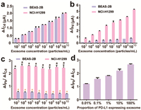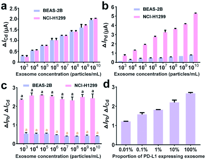 | Fig. 3. (a) ΔICd and (b) ΔIPb obtained with different concentrations of normal exosomes derived from BEAS-2B and cancer exosomes derived from NCI-H1299 (From 103 to 1010 particles/mL). (c) ΔIPb/ΔICd obtained with different concentrations of BEAS-2B-derived exosomes and NCI-H1299-derived exosomes. (d) The relationship between the ΔIPb/ΔICd and the proportion of PD-L1-expressing exosomes in mixed samples from 0.01% to 100%. | |