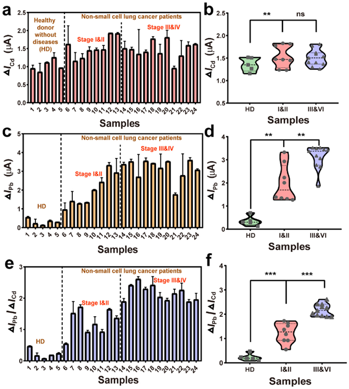 | Fig. 4. (a) ΔICd and (b) violin plots of ΔICd obtained in the clinical samples from healthy donors without diseases (HD) and patients diagnosed with non-small cell lung cancer at the early stages (Stage Ⅰ&Ⅱ) and the advanced stages (Stage Ⅲ&Ⅳ). (c) ΔIPb and (d) violin plots of ΔIPb obtained in the clinical samples. (e) ΔIPb/ΔICd and (f) violin plots of ΔIPb/ΔICd obtained in the clinical samples. In (b), (d), and (f), statistical significance was calculated by two-tailed Student’s t-test; ns, nonsignificant; **P < 0.01; ***P < 0.001. | |